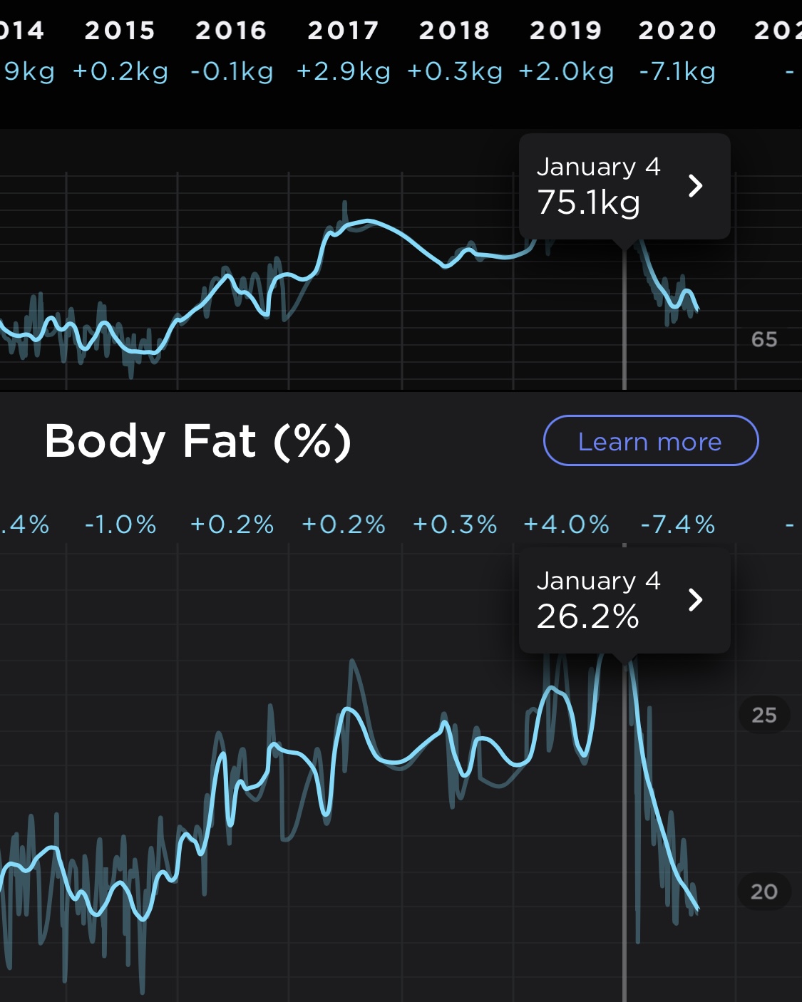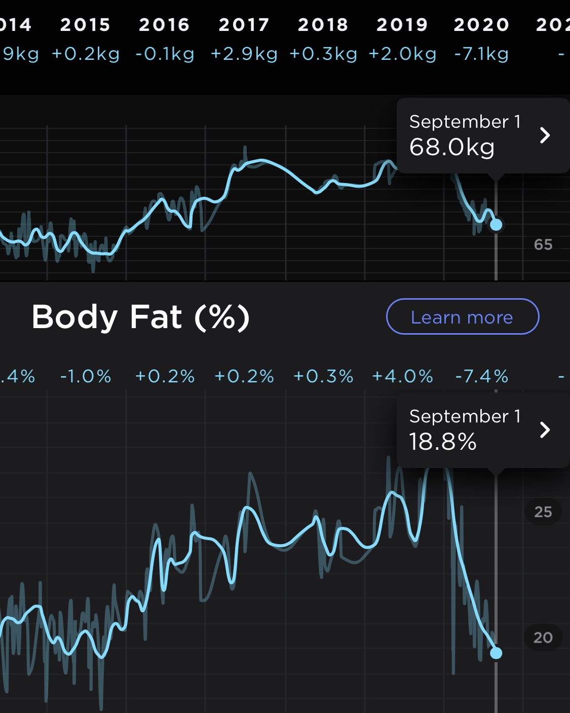 定量的に観測し続けることで、変化に適切に対応し、限界を知ることができます。数字で見ることでこれくらいなら喰ってもセーフ、これくらいの運動量で挽回できる、というのが減量期の感覚として身に付けられました。